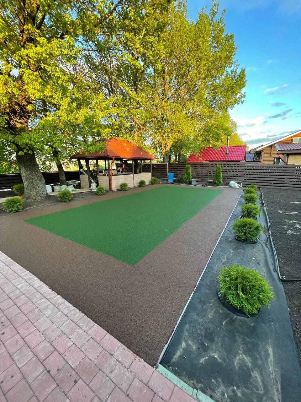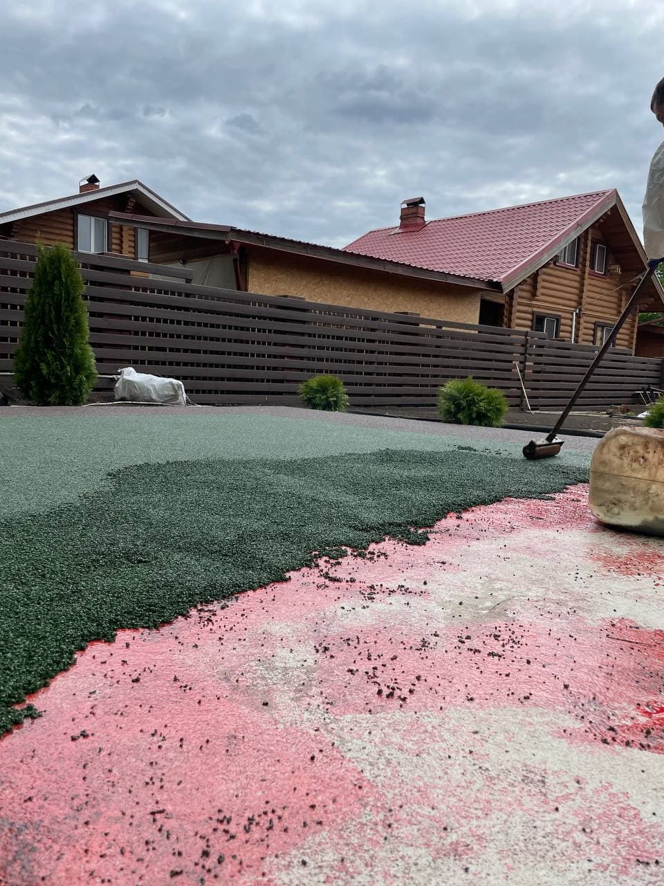 5. материалы: Химтраст ПУ-Клей для резиновой крошки (1К), Химтраст Праймер-РК (1К), Резиновая крошка коричневая, Резиновая крошка изумруд;